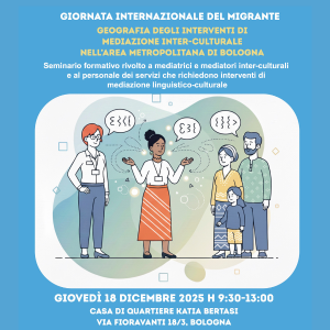 Giovedì 18 dicembre 2025, dalle 9.30 alle 13.00, presso la Casa di Quartiere Katia Bertasi (via Fioravanti 18/3, Bologna), si terrà un seminario formativo rivolto a mediatrici e mediatori inter-culturali e al personale dei servizi che richiedono interventi di mediazione linguistico-culturale.
