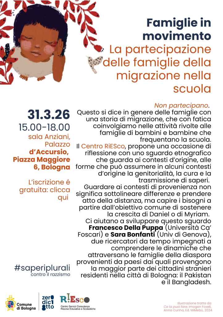 Il Centro RiESco, propone una occasione di riflessione con uno sguardo etnografico che guarda ai contesti d’origine, alle forme che puó assumere in alcuni contesti d’origine la genitorialità, la cura e la trasmissione di saperi.