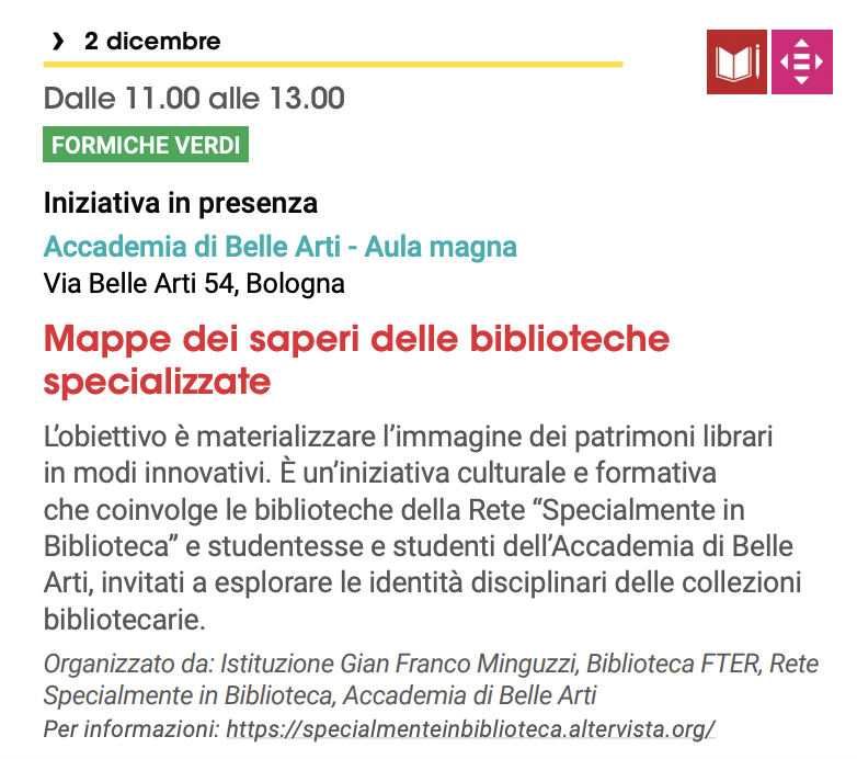Nell’ambito del Festival della Cultura Tecnica 2025, la Biblioteca del Centro RiESco parteciperà all’incontro di presentazione del progetto promosso dalla Rete delle biblioteche specializzate di Bologna “Specialmente in Biblioteca”, in collaborazione con l’Accademia di Belle Arti.