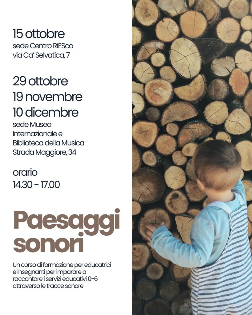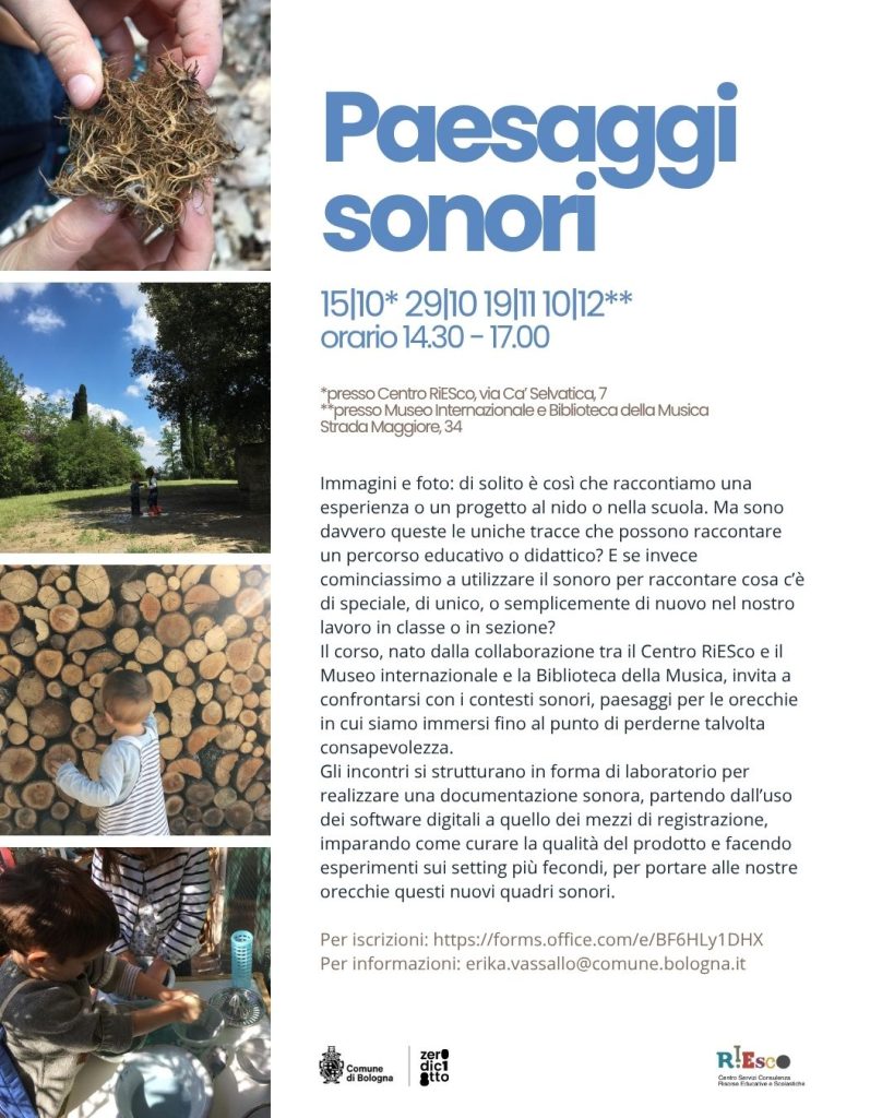 ll Centro RiESco accoglie la sfida di provare a raccontare i contesti educativi attraverso le tante tracce sonore che ogni giorno si possono registrare proponendo un corso di formazione in collaborazione con gli esperti del Museo internazionale e Biblioteca della Musica di Bologna. Quattro incontri per confrontarsi con i contesti sonori, paesaggi per le orecchie in cui siamo quotidianamente immersi al punto di perderne consapevolezza. Attraverso la